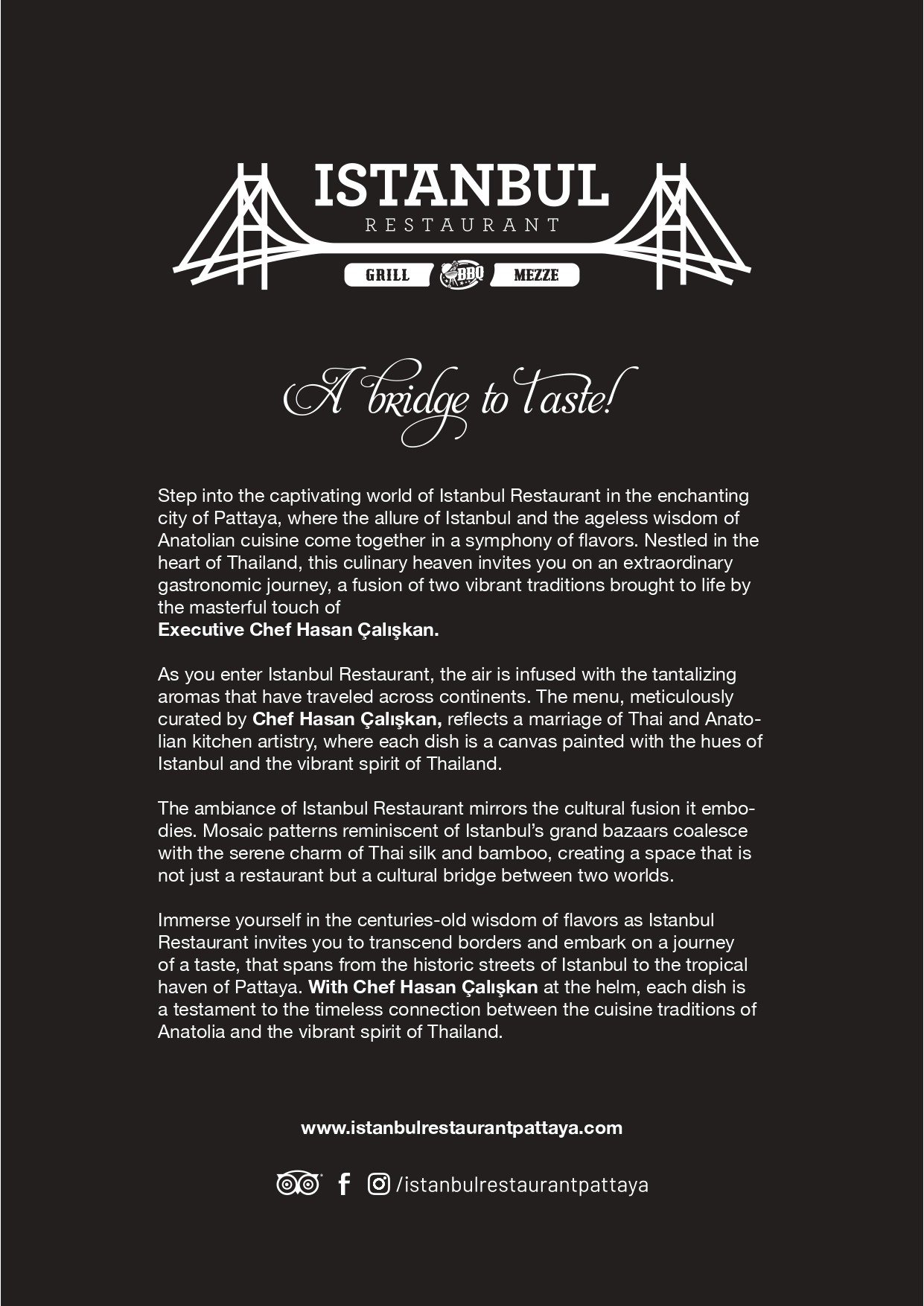 Our mission is to bring the authentic flavors and vibrant culture of Turkey to the heart of Pattaya. By combining traditional cooking methods with the finest local and imported ingredients, we aim to offer a unique dining experience where guests can enjoy the warmth of Turkish hospitality and the richness of our culinary heritage. We are committed to excellence in quality, taste, and service, making every visit memorable for our patrons.